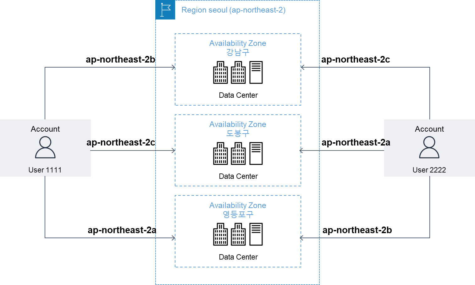 아래 예시 이미지를 보면 쉽게 이해 할 수 있다. 계정마다 AZ-a, AZ-b, AZ-c가 있는데 사실상 램덤으로 돌려져있어서 실제로 AZ-a, AZ-b, AZ-c 데이터센터가 어디에 있는지 우리는 알 수가 없다.