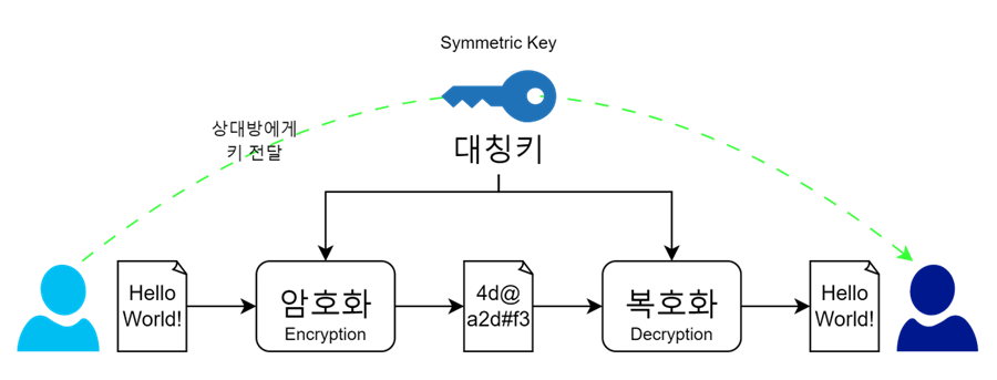 대칭키는 🔑하나의 키를 사용하여 데이터를 암호화(Encryption)하고 복호화(Decryption)하는 방식이다.