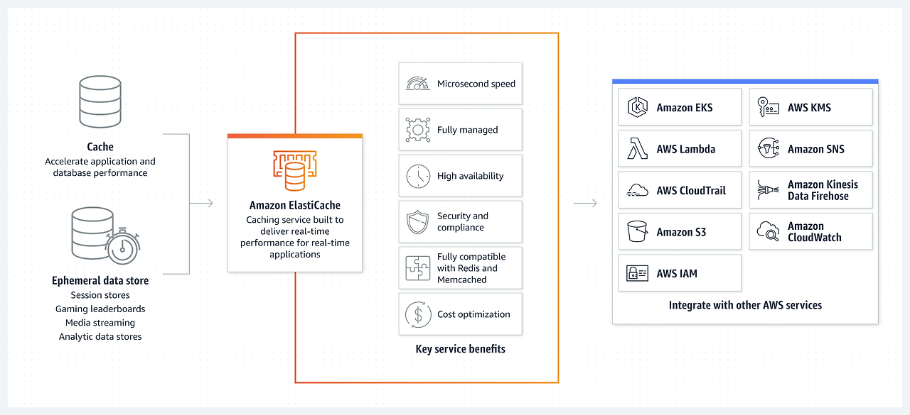 - RDS나 Redshift와 같은 다른 데이터베이스 서비스와 연계하여 쿼리 결과를 ElastiCache에 캐시함으로써 전체적인 성능을 향상시키는 방식으로 활용할 수 있다.