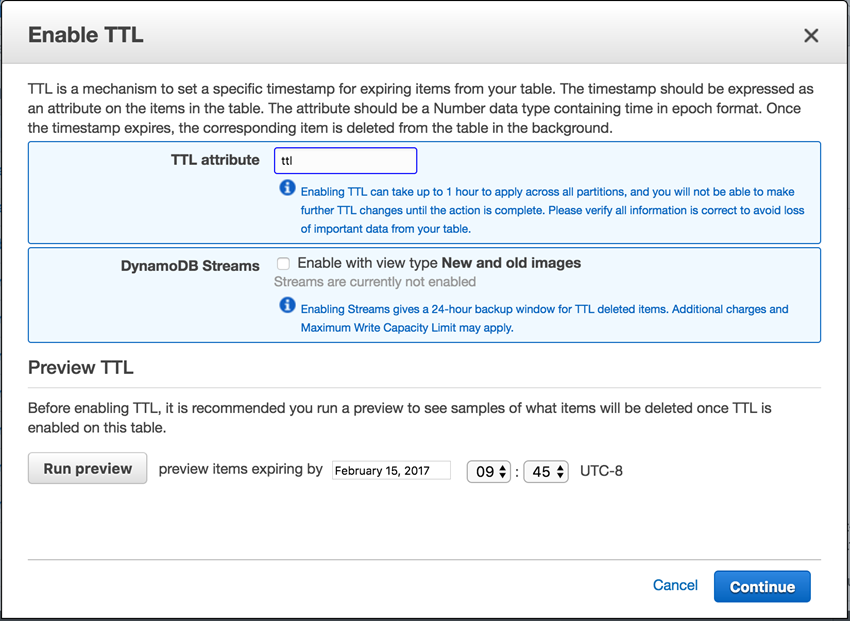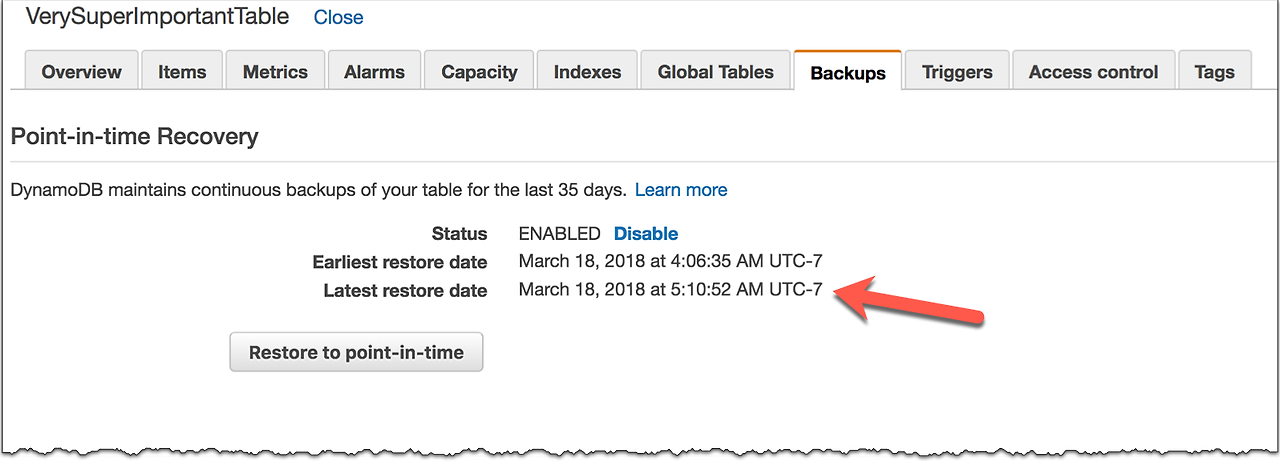 이 기능은 내부적으로 DynamoDB의 Point-in-time recovery을 사용하므로, 대상 테이블의 Point-in-time recovery를 활성화해 두어야 한다.