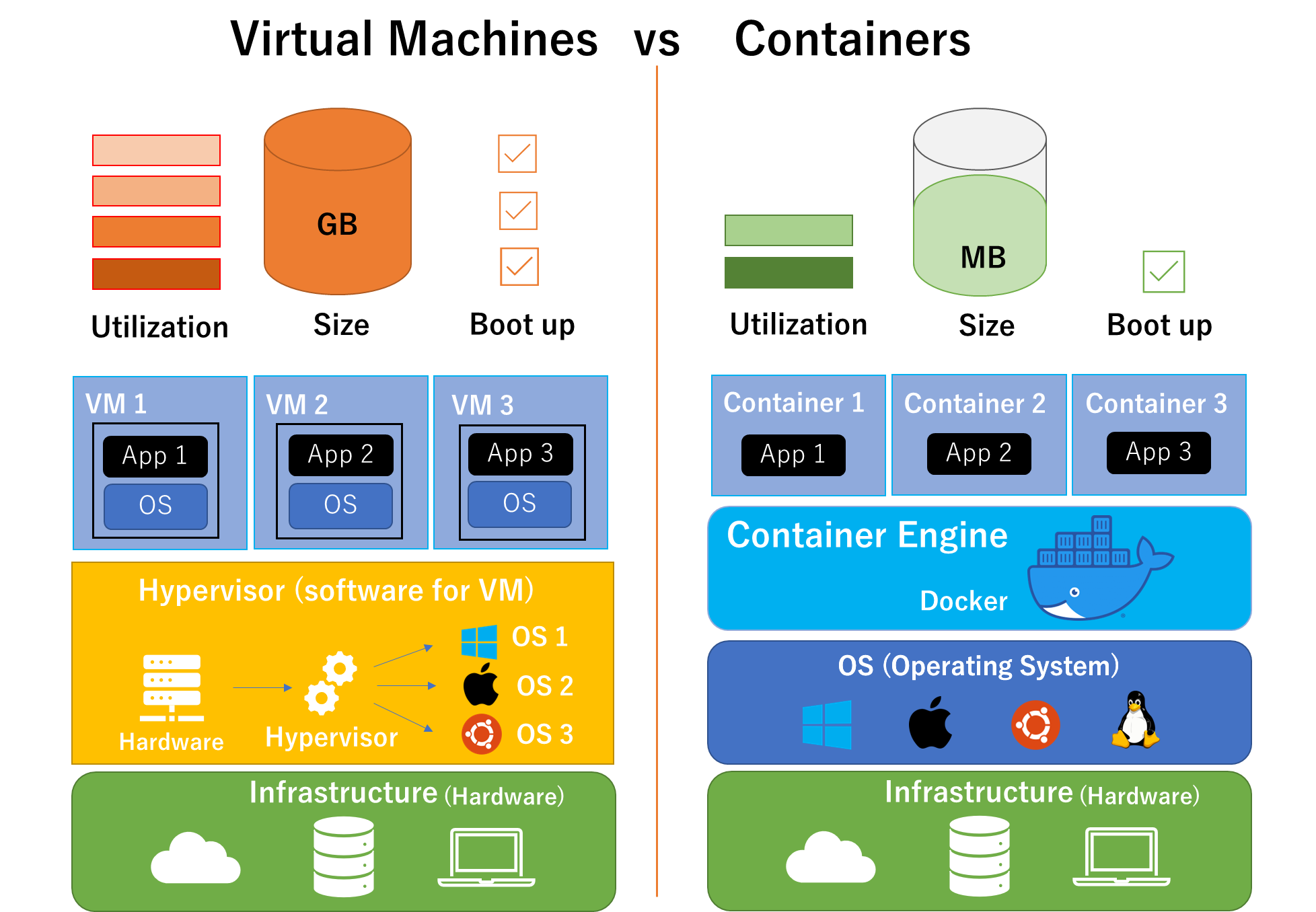 하지만 docker은 기존의 OS위에 바로 이용하기 때문에 용량을 덜 차지한다.