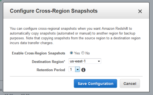 - 리전을 넘나들기 때문에 데이터 전송 비용이 추가로 발생하지만, 재해에 대비하거나 다른 리전에서 Redshift 클러스터를 재구축하려는 경우에 유용하게 사용할 수 있다.