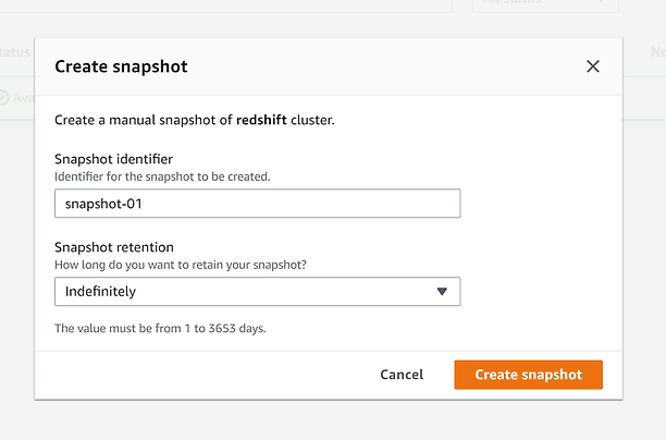 - 스냅샷은 수동으로 생성할 수 있다. 수동으로 생성한 스냅샷은 저장 기간을 무기한(indefinitely)으로 설정할 수도 있다.