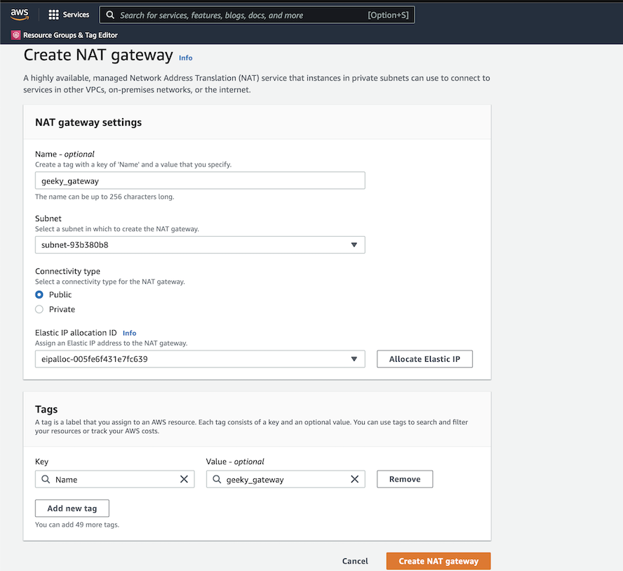 VPC 대시보드 → NAT Gateways → Create NAT Gateway