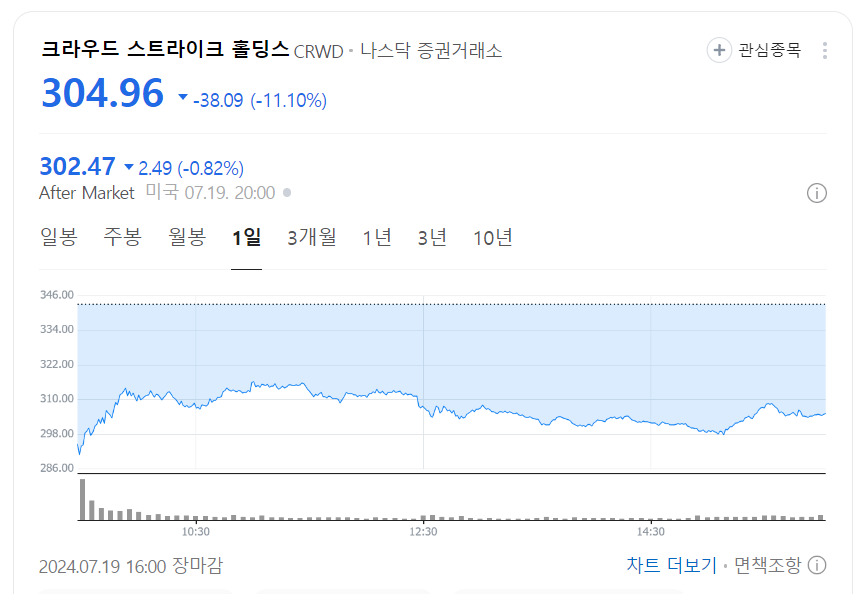 크라우드스트라이크의 주가는 하루사이에 약 11퍼센트나 폭락해버렸다.