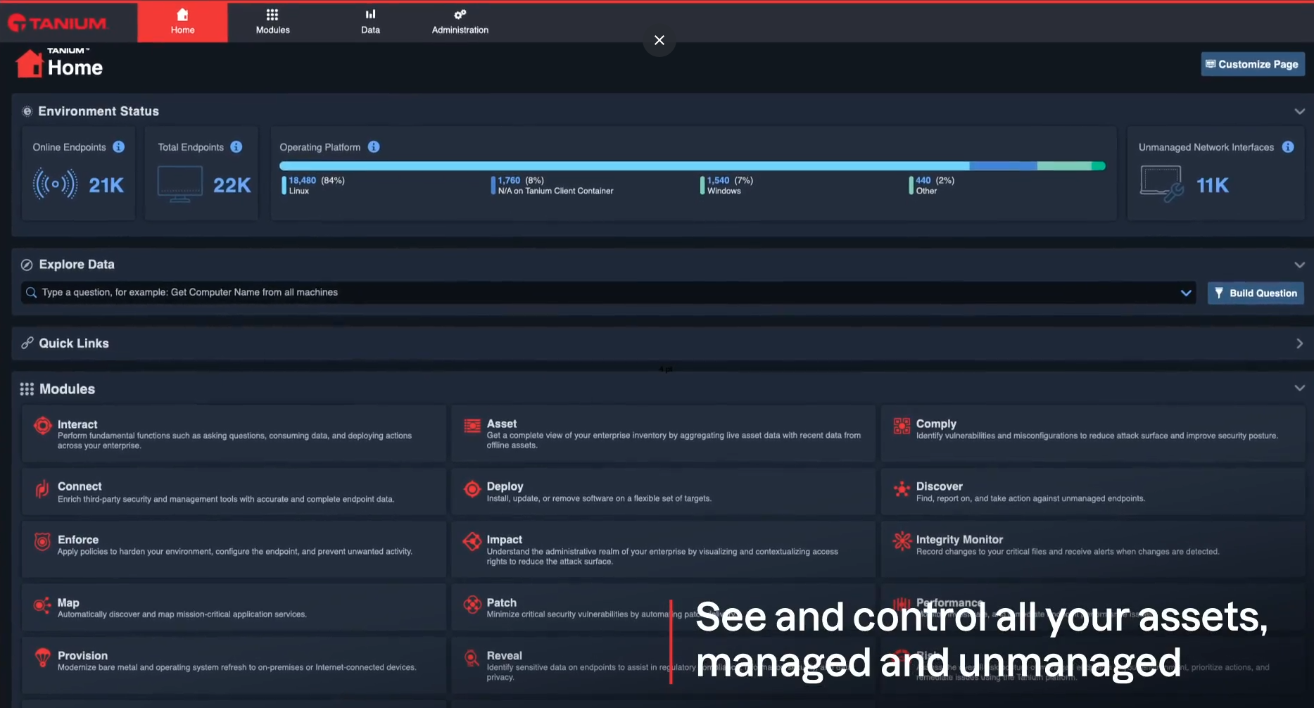 수만 대의 네트워크 장치를 관리하는 대기업일 경우, 모든 네트워크 장치가 최신 상태인지, 바이러스에 감염되지 않았는지 확인할 수 있다. (Tanium은 수십만개의 네트워크 장치 관리도 가능하다)