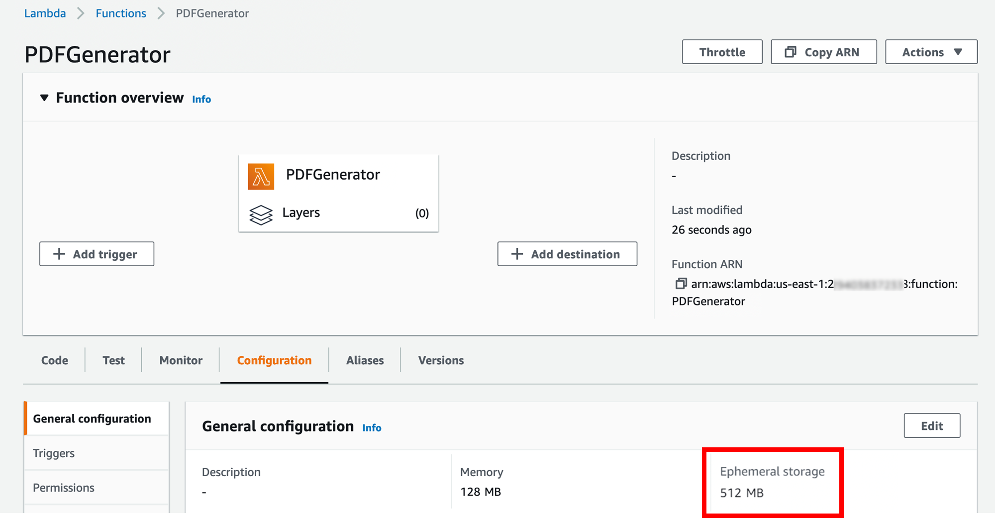 EphemeralStorage The size of the function's /tmp directory in MB. The default value is 512, but can be any whole number between 512 and 10,240 MB. For more information, see Configuring ephemeral storage (console). Contents Size The size of the function's /