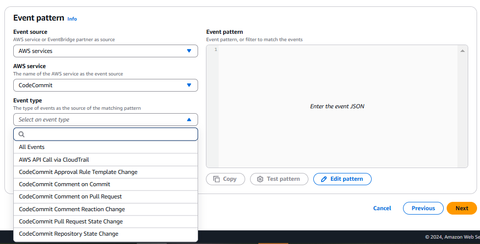 - Event type: "CodeCommit Pull Request State Change" 선택