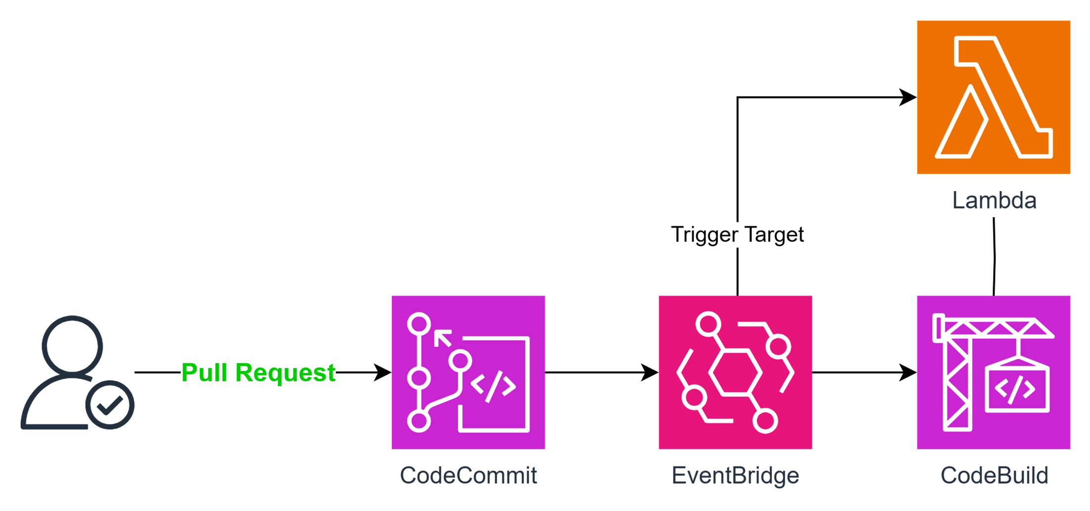 Pull Request 생성 > CodeCommit (EventBridge가 Lambda를 trigger) > CodeBuild (Lambda가 Unit-Test 실행)