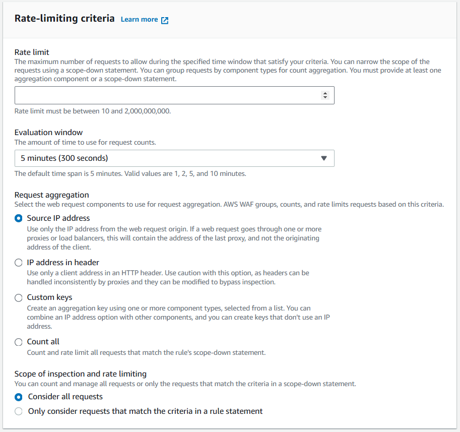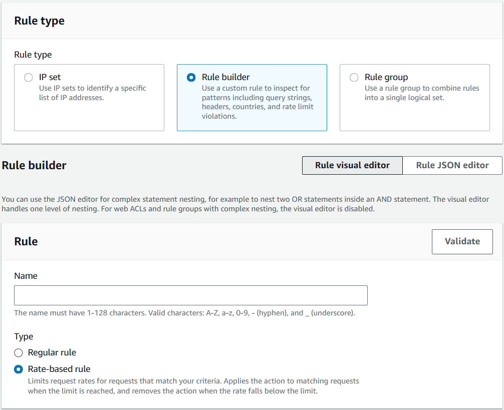 Web ACL → Add rules → Add my own rules and rule groups → Rule builder → Rule type: Rate-based rule