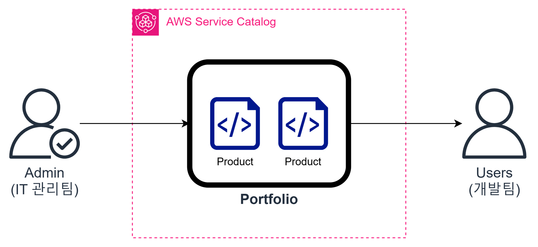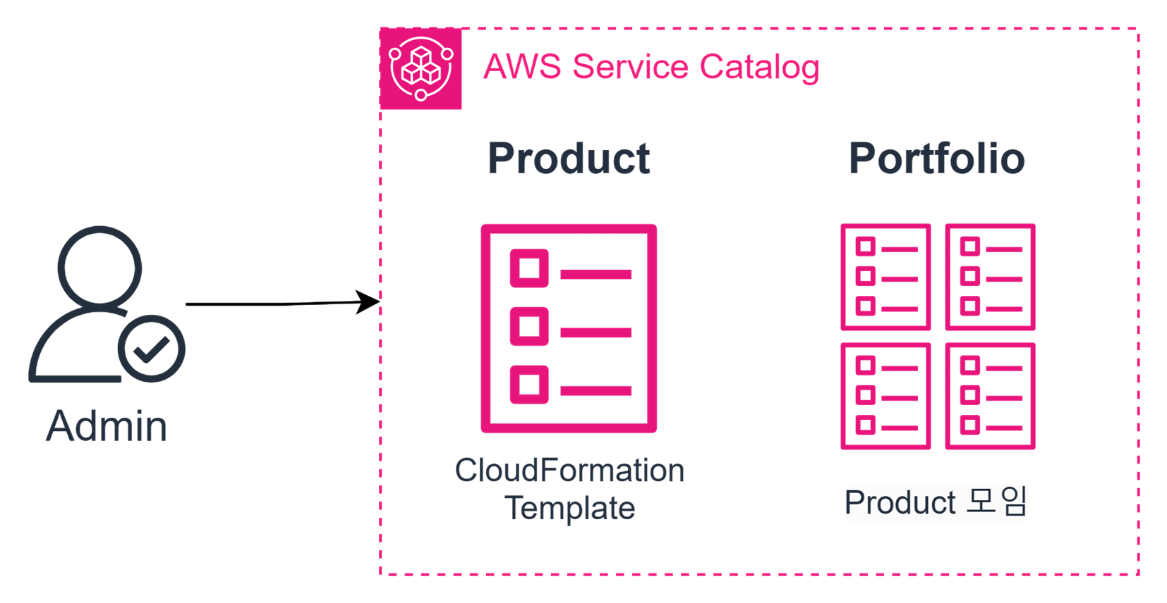 관리자(Admin)는 Portfolio를 생성하고, Product을 추가한 후, 특정 사용자, 그룹, 계정, 또는 조직에 Portfolio를 공유한다.