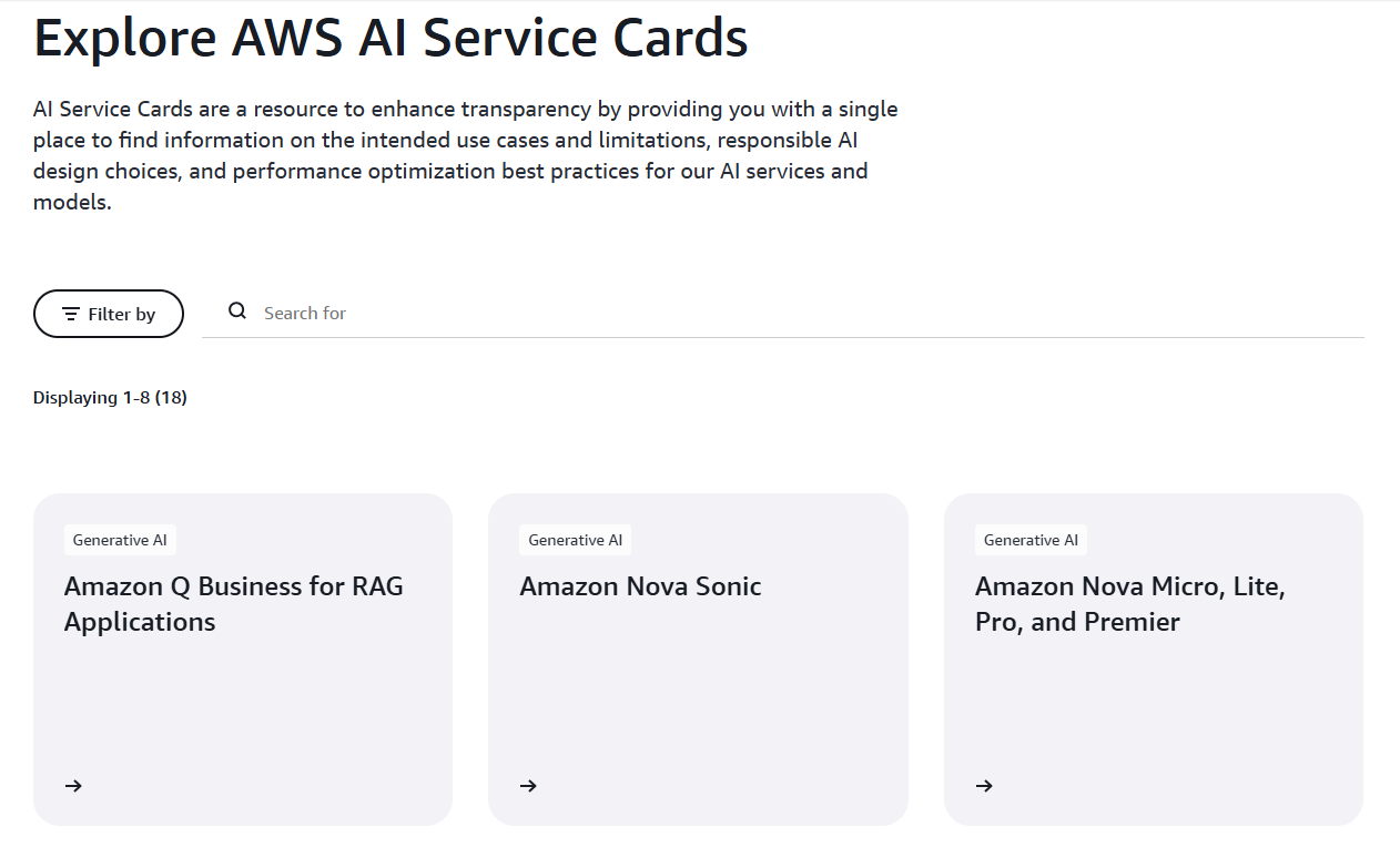 AWS가 제공하는 AI 서비스의 핵심 정보를 적어둔 카드 형태의 안내서 (Responsible AI 고려 사항)