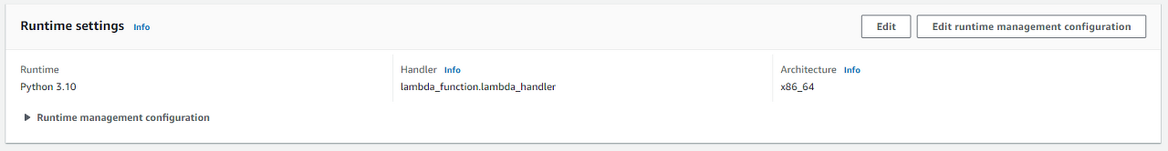 Lambda를 어떤 프로그래밍 언어와 버전으로 작성할지 정하는 옵션 (ex. Java, Node.js, C#, Go, Python) - Handler (핸들러):