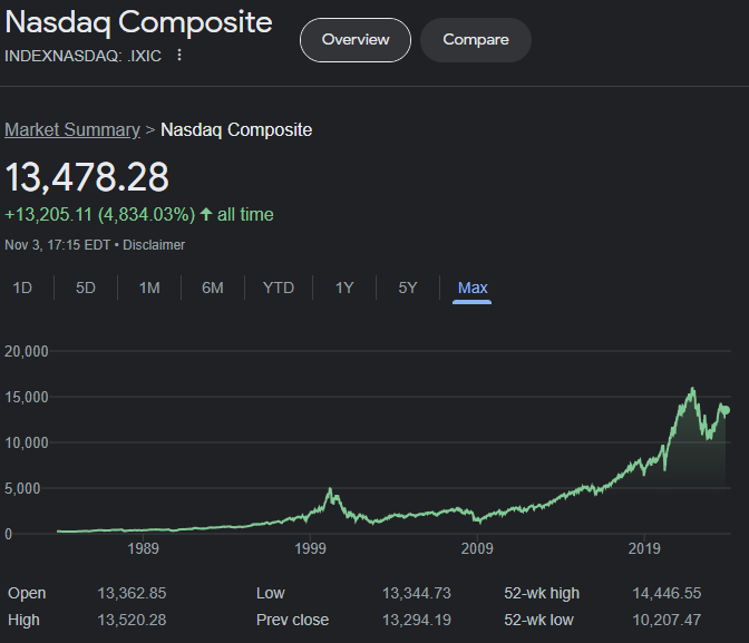 나스닥 복합 지수는 나스닥 증권거래소에 상장돼 있는 약 3,000개 기업의 시가총액을 가중평균하여 나타낸 수치이다. (= 나스닥 증권거래소에 상장 되어있지 않은 주식은 고려하지 않는다.)