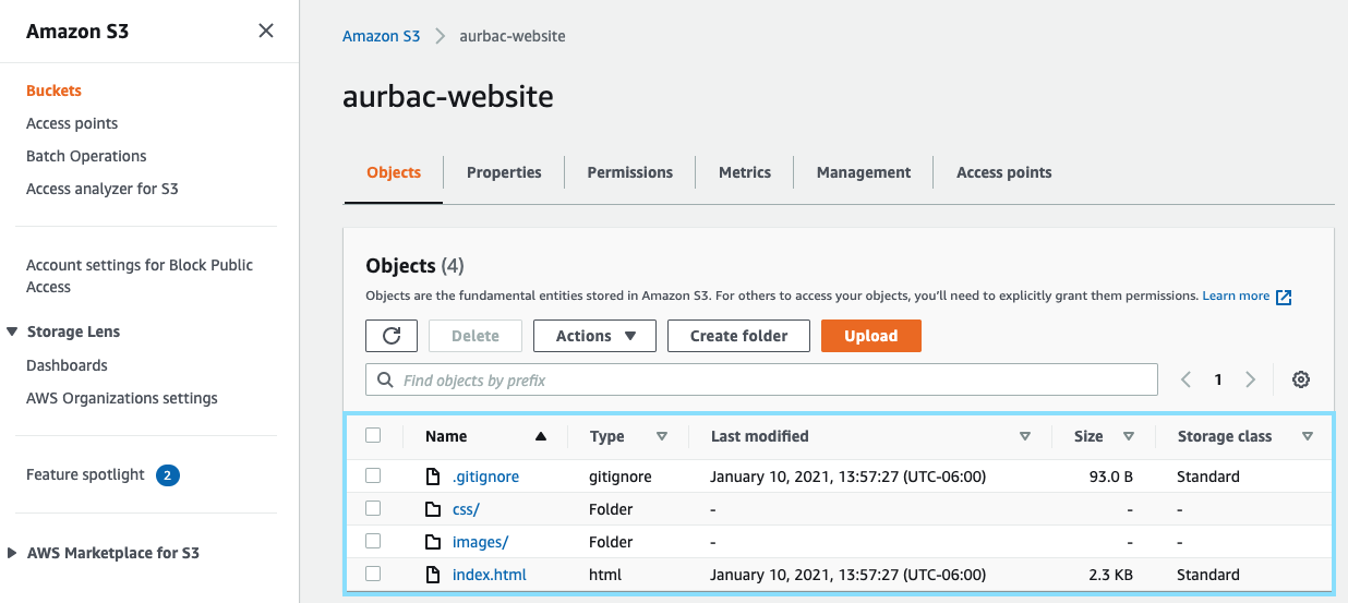 AWS Management Console → Amazon S3 → Objects 탭 → index.html와 error.html 파일을 업로드