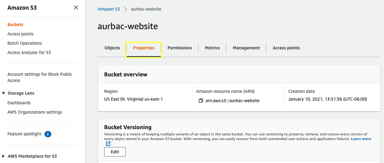 AWS Management Console → Amazon S3 → 생성한 bucket을 클릭 → Properties 탭