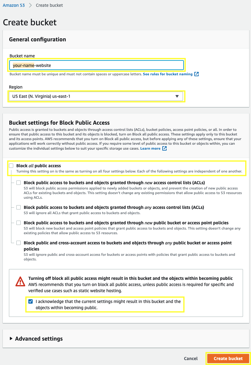 - "Block all public access"(모든 퍼블릭 액세스 차단) 설정을 끕니다. AuthenticatedUsers 수혜자에게 접근을 허용하는 버킷 ACL을 사용하여 퍼블릭 액세스를 허용합니다.