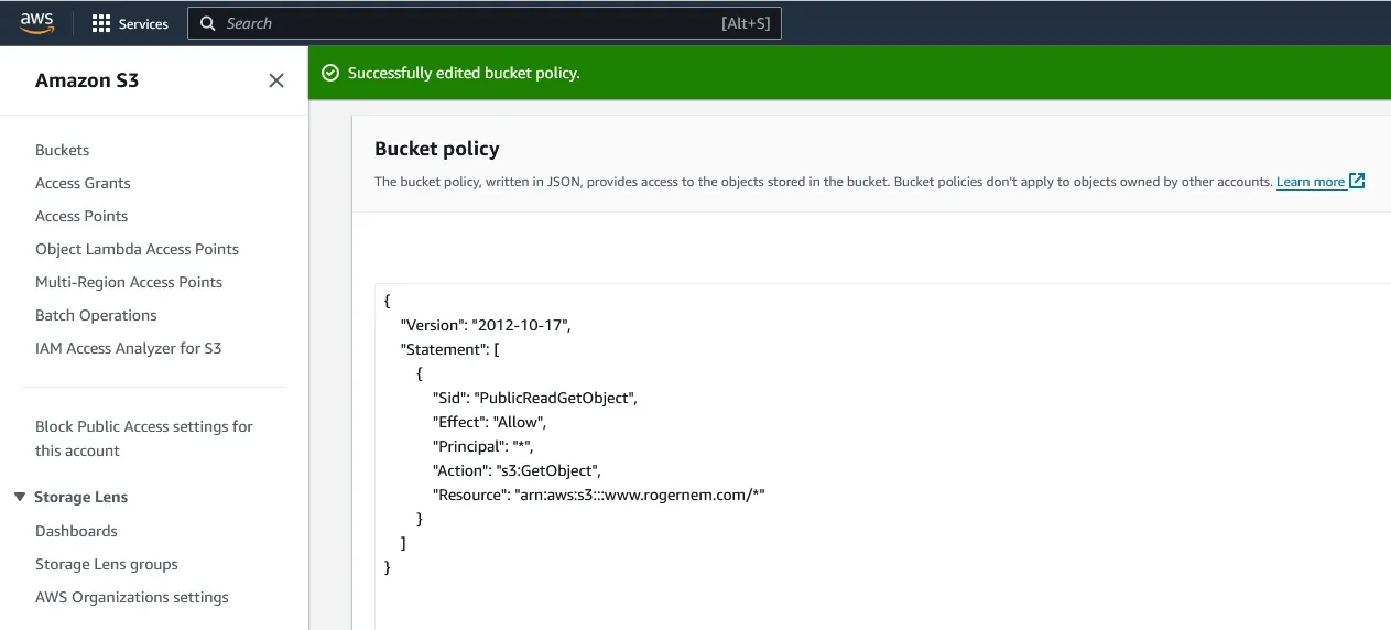 S3 객체는 기본적으로 비공개 상태이다. 웹사이트 파일에 퍼블릭 읽기 권한을 부여하려면 bucket policy를 변경해야한다.