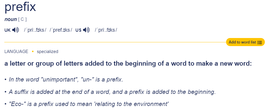 사전적 의미: "접두사", "단어의 앞에 붙어서 그 뜻을 바꾸거나 새로운 의미를 추가하는 요소"