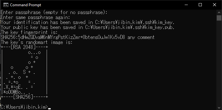 ssh-keygen -t rsa -b 2048 -C "any comment" -f C:\Users\jibin.kim\.ssh\kim_key