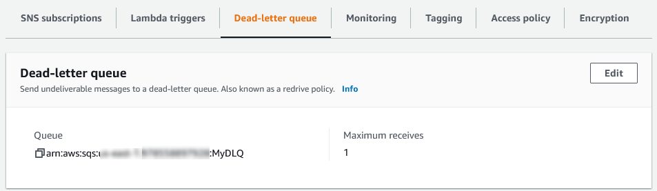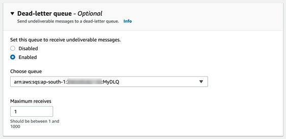 - Maximum Receive의 값이 3으로 설정되어 있으면, 한 메시지가 세 번 읽혔지만 여전히 처리되지 않았다면 그 메시지는 DLQ로 이동한다.