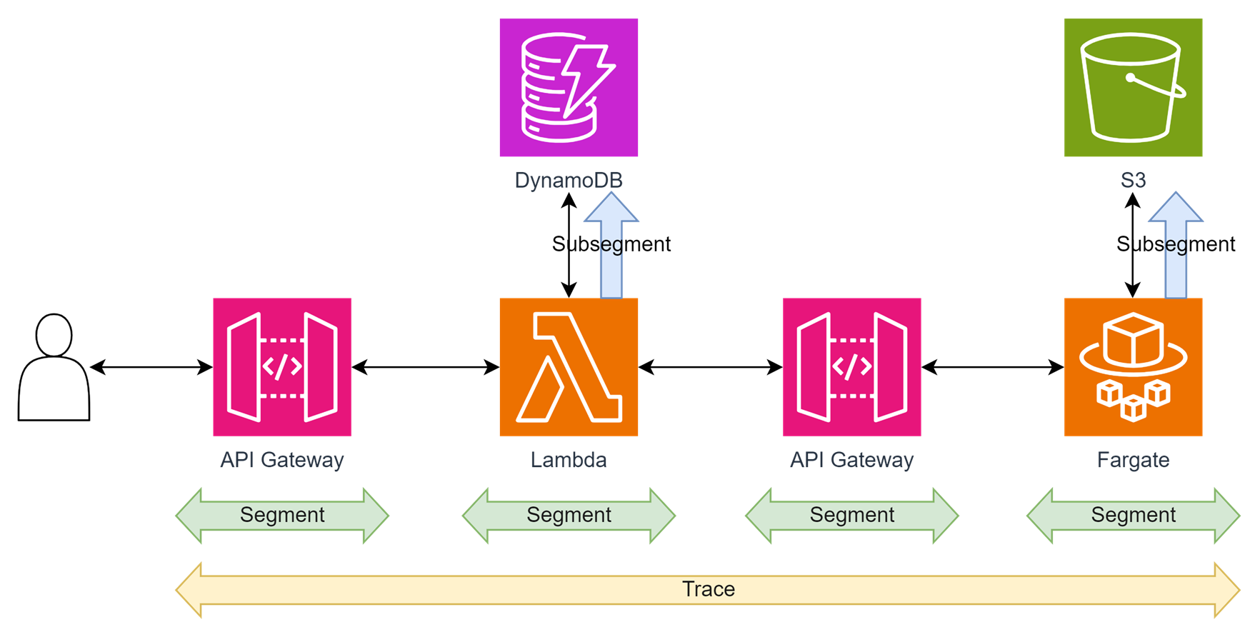 - Segment: 각 요청의 세부 정보가 저장된다. (리소스의 이름과 세부 정보, 수행한 작업에 대한 세부 정보)